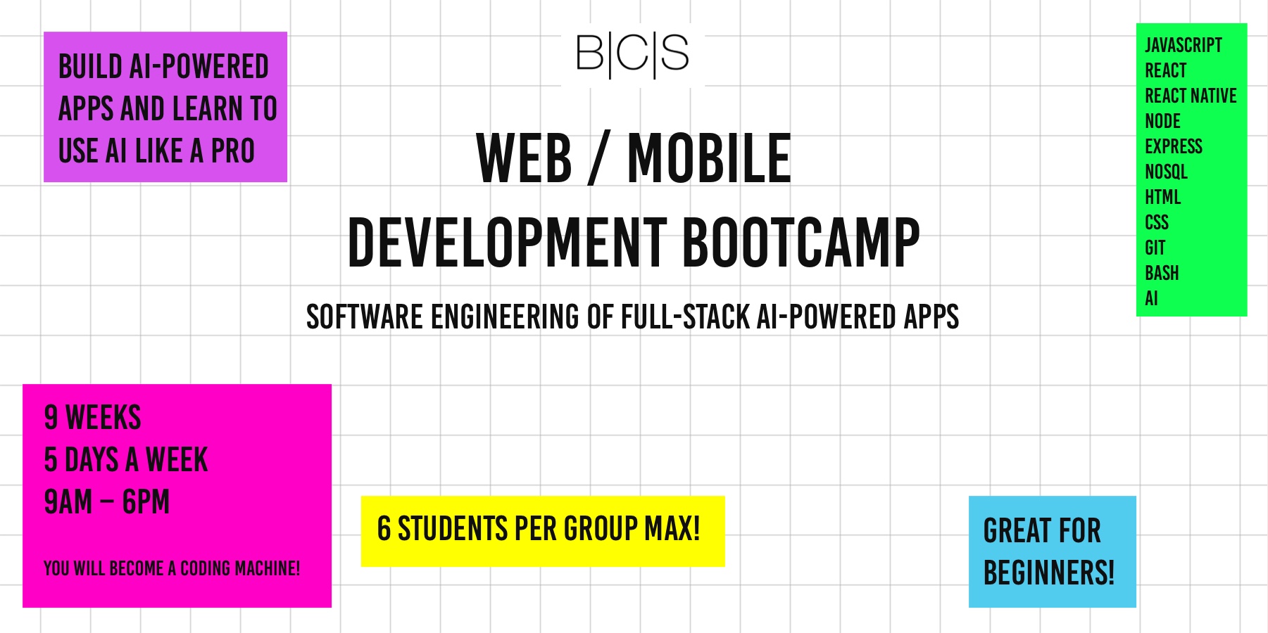 Our course is focused primarly on developing web and mobile apps (for both iOS and Android) with the JavaScript MERN stack which includes React, TypeScript, Node, Express, mongoDB and of course JavaScript, HTML, CSS + React Native for mobile developemnt.